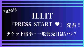 ILLIT 【ILLIT】2026年ライブ発表!チケット倍率がやばい?一般発売日はいつ? K-POPの5人組グループの『ILLIT』が2026年に日本ツアー『PRESS START♥』の発表がありましたよね!有名な曲と言えば『Msgnetic』など爆発的に人気のあるILLITさんですが、ライブ公演に行って一緒に盛り上がりたい方は... 2026.01.23 ILLIT