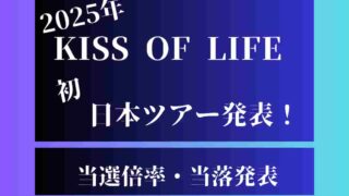 KISS OF LIFE KISS OF LIFEライブ2025倍率!チケット当選確率は?当落発表・一般発売日はいつ? KISS OF LIFEさんの日本ツアー『Lucky Day』の開催が発表されましたよね。日本ツアー”初”となりますので、楽しみな方は多いのではないでしょうか?そこで気になるチケット当選確率と当選発表日・一般発売をご紹介しますKISS OF... 2025.10.06 KISS OF LIFE