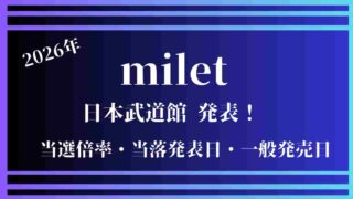 milet miletライブ2026倍率!チケット当選確率?当落発表日・一般発売日はいつ? miletさんがファンクラブ限定ライブを行いましたが、そこで嬉しい報告がありましたよね。それは2026年の2月に武道館ライブを行ってくれる事を発表されました。一時期活動休止されていたので心配でしたが、元気な姿でライブ公演を行てくれるので、一... 2025.10.19 milet