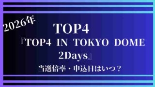 TOP4 【TOP4】ライブ2026!チケット倍率がやばい!申込日はいつ? TOP4さんが東京ドームでライブ公演『TOP4 IN TOKYO DOME 2Days』 を行う事を発表されましたよね!続々とSNSで話題になり、当選チケットが手に入るのかな?と思います。人気のあるTOP4さんのチケットですからかなりやばい... 2026.02.11 2026.02.12 TOP4