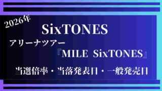 SixTONES(ストーンズ)が来年2026年にアリーナツアー『MILESixTONES』を開催される事を発表されましたよね!メディアでも大活躍されているグループですので、チケット当選倍率も高くなると予想でき当選チケットを手に入れれるか気に...