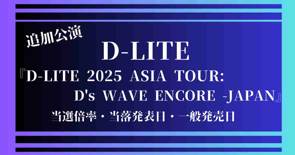 D-LITEさんのライブ公演『D-LITE 2025 ASIA TOUR: D’s WAVE ENCORE -JAPAN』のチケット当選確率は9,5倍~53,2倍になります。