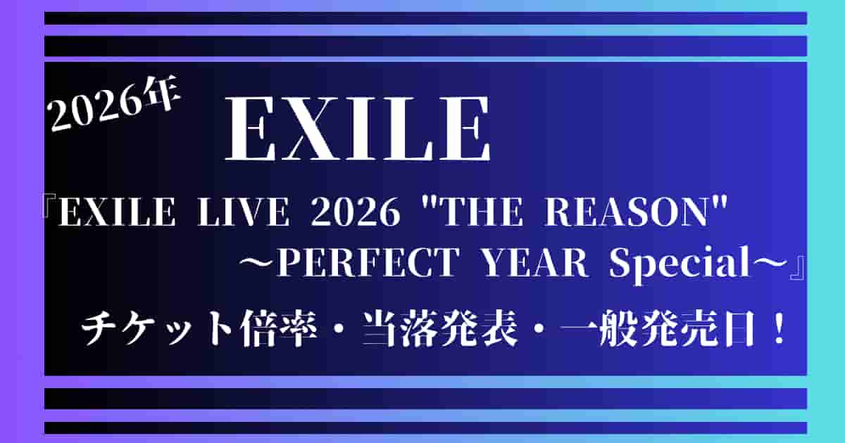 EXILEさん達のライブ公演『EXILE LIVE 2026 “THE REASON”〜PERFECT YEAR Special〜』のチケット当選確率1,9倍~16,2倍になります。
