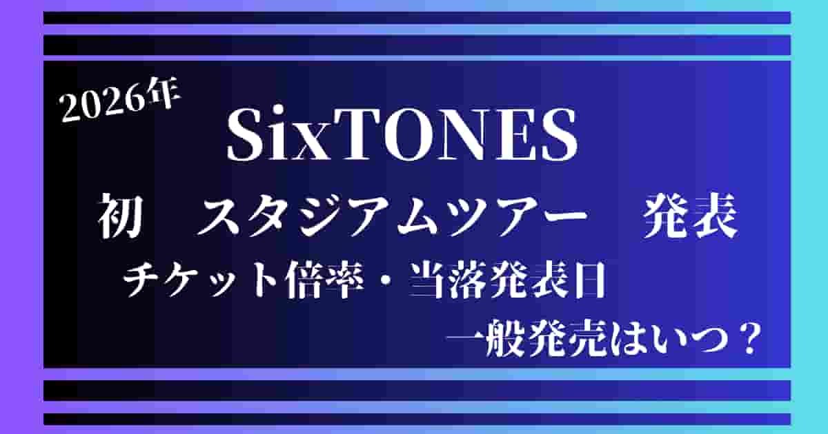 SixTONESさん達が2026年の秋に初のスタジアムツアー『SixTONES LIVE TOUR 2026″MILESixTONES”』を開催される事を本日3月29日に発表され、人気の高いグループになり、初のスタジアムツアーになりますので、チケット倍率がやばい倍率になる事が予想できます。